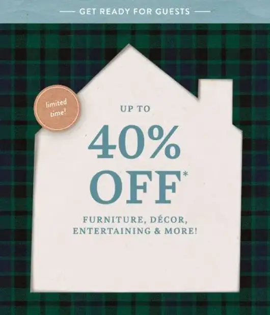 Stop by and get up to 40% off on furniture, decor, entertaining & more in store for a limited time.